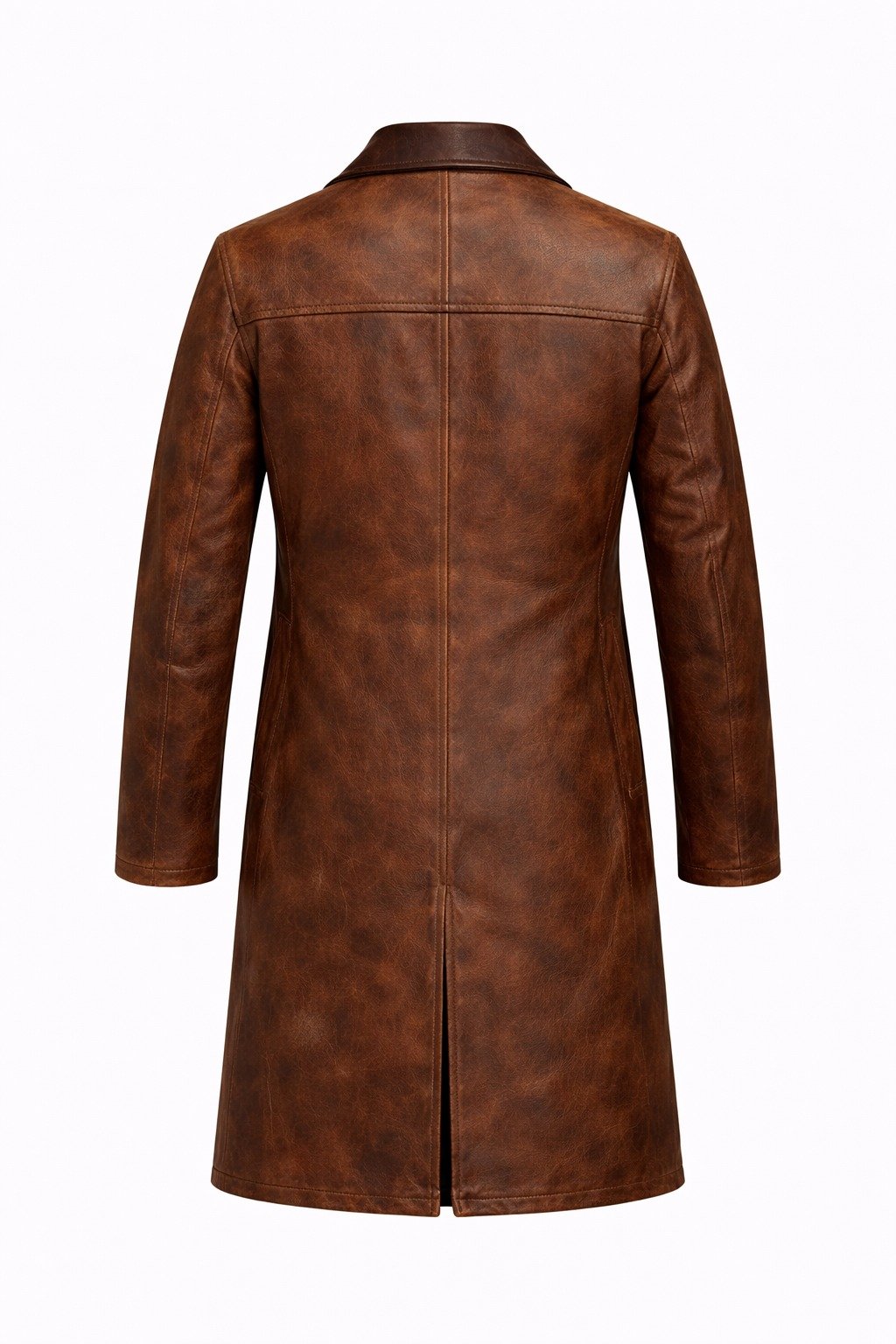 Hey man, step up your outerwear game with this brown cowhide trench coat for men – a double-breasted overcoat that’s built to last. Crafted from 1.2mm premium genuine cowhide leather, it offers unbeatable durability and a buttery-soft feel that molds to you over time. The knee-length design with a rear vent keeps you moving freely, while the full satin lining and two inside pockets add everyday comfort and convenience.