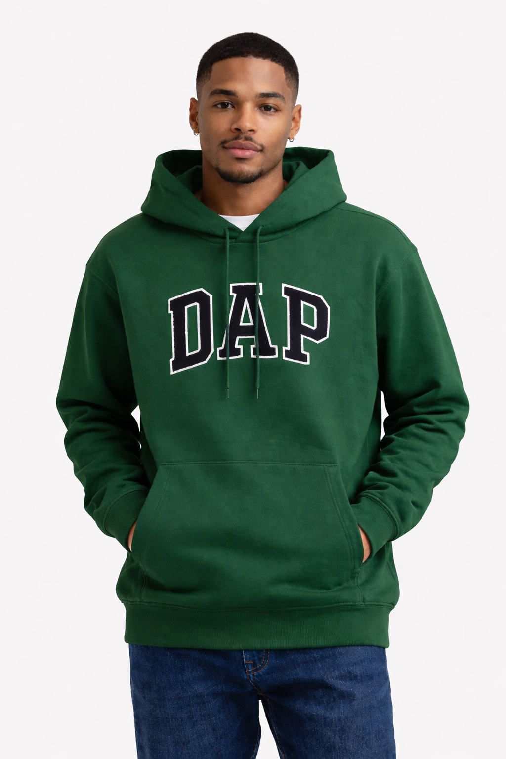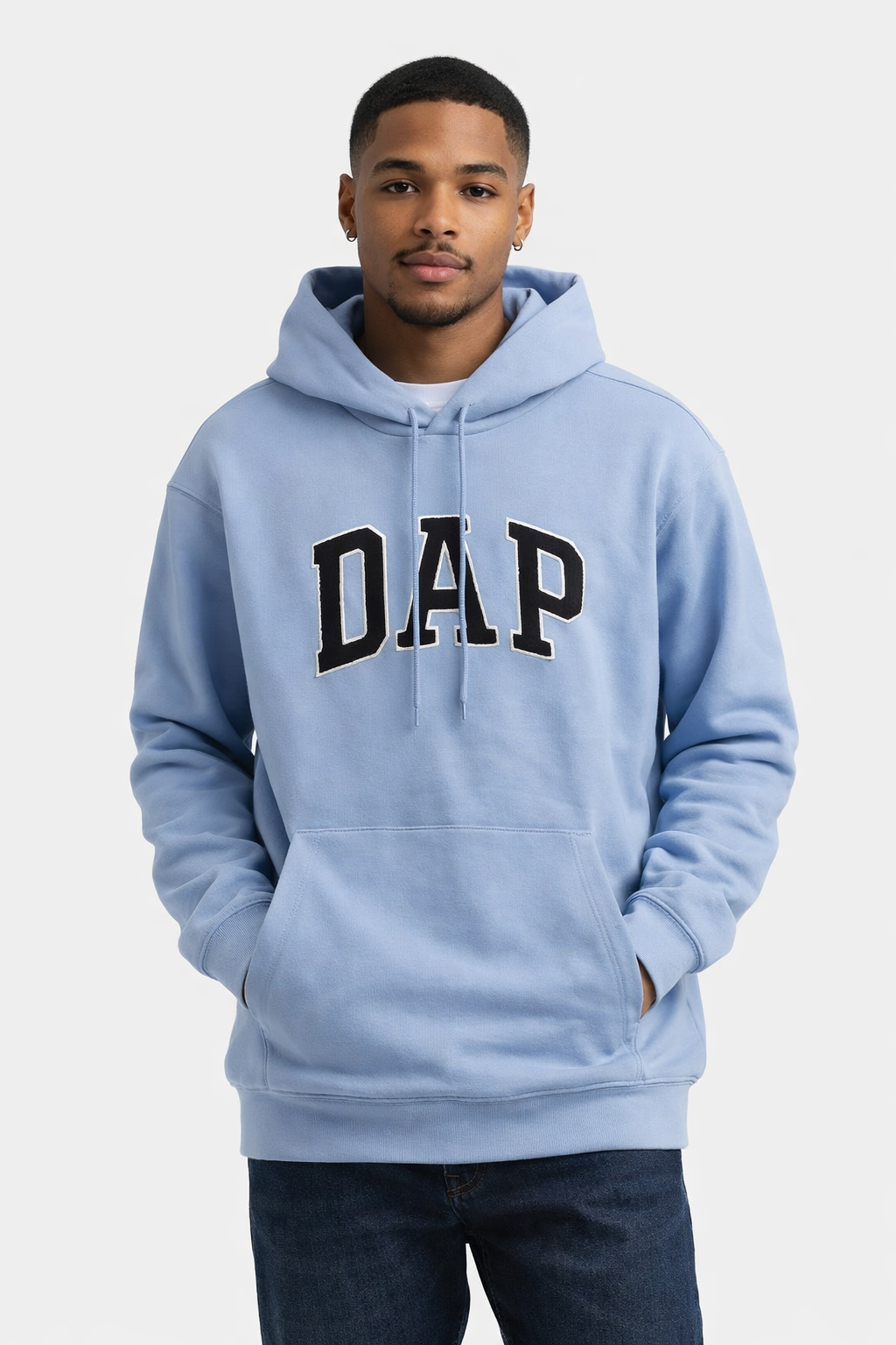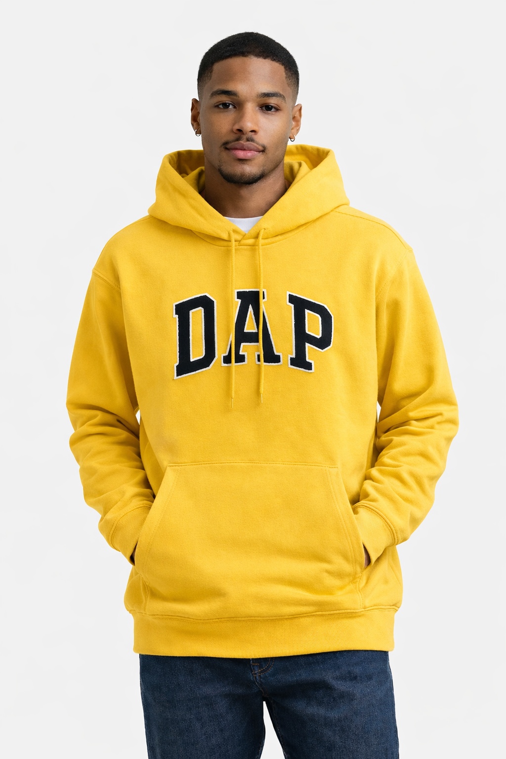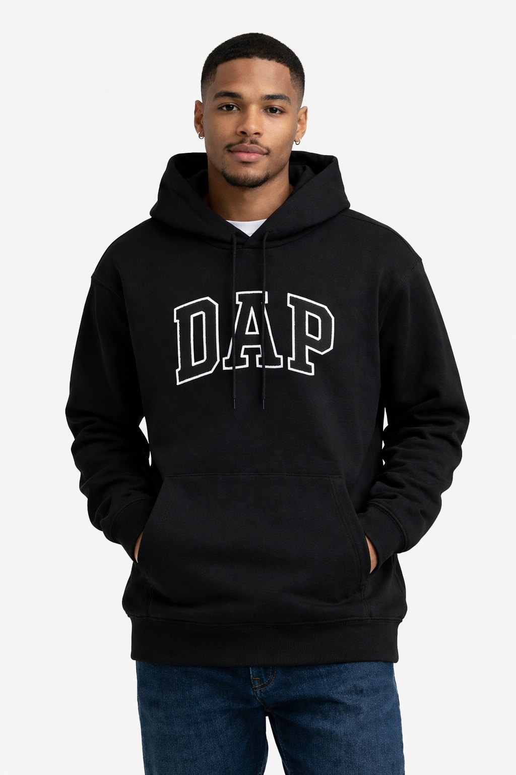 Hey man, channel Harlem vibes with the Gap x Dapper Dan DAP Pullover Hoodie—legendary logo that pops under your biker jacket. Soft 77% cotton/23% polyester fleece keeps you cozy without bulk. Key specs: relaxed fit hitting at the hip (size down for classic), adjustable drawcord hood, long sleeves with ribbed cuffs, bold applique DAP Harlem logo on chest, and kangaroo front pocket. Machine-washable for easy wins. Why grab it? Effortless street style pairs perfect with shearlings or bombers—warm, breathable, and built to last. Your new layer for city cruises or gym runs.