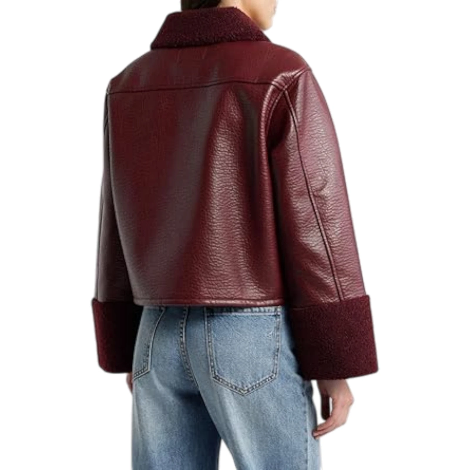 Handmade Women’s Burgundy Leather Shearling Jacket – Faux Fur Trim