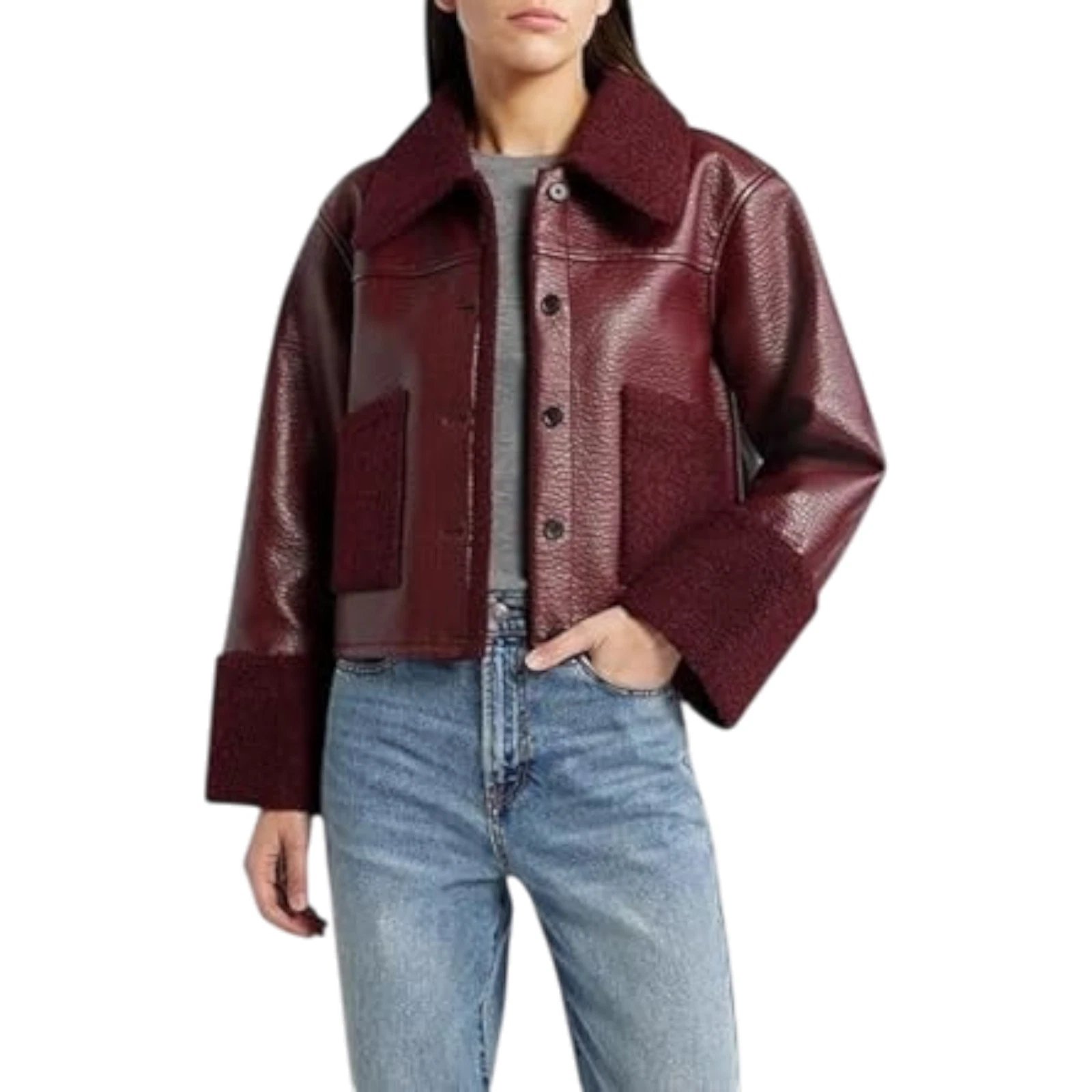 Looking for a bold outer layer with a classic touch? Our handmade women’s burgundy leather shearling jacket is made from 100% real leather for unbeatable quality and rich texture. The plush faux fur trim lines the collar, cuffs, and interior, keeping you cozy on chilly days without bulk. Tailored in a cropped, boxy silhouette, it offers effortless layering whether you’re running errands or heading out for dinner. Large patch pockets add function and flair, while the button-up closure secures warmth. Perfect for fall and winter, this standout piece easily elevates your style. Make a statement and stay warm—this jacket is where comfort meets enduring appeal.