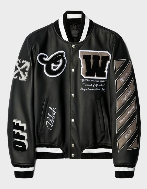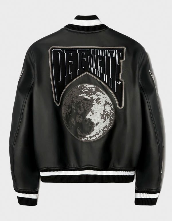 Men’s OFF White Moon Black Leather Varsity Jacket – Retro Bomber Style