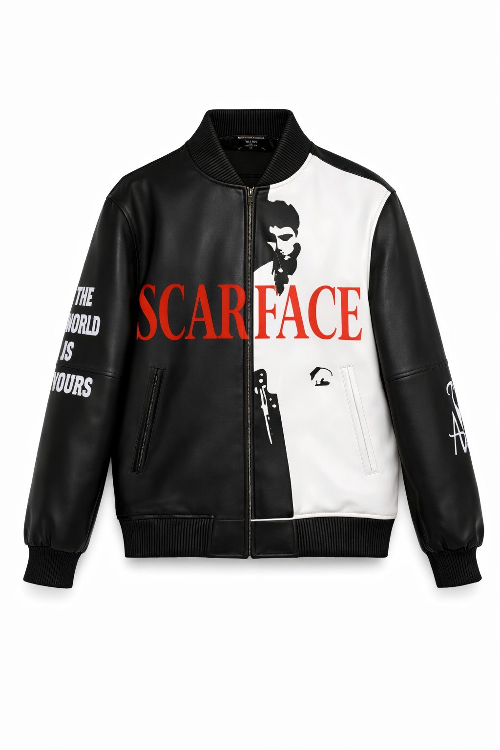 This Supreme Scarface Bomber Jacket brings a legendary movie aesthetic to modern streetwear. Crafted from premium faux leather, it features a half-black, half-white split design with a bold SCARFACE front print and SUPREME branding on the back. The sleeves are detailed with phrases like “The World Is Yours” and “The American Dream“, symbolizing ambition and power. Ribbed cuffs, hem, and a full front zipper ensure comfort and a perfect fit.