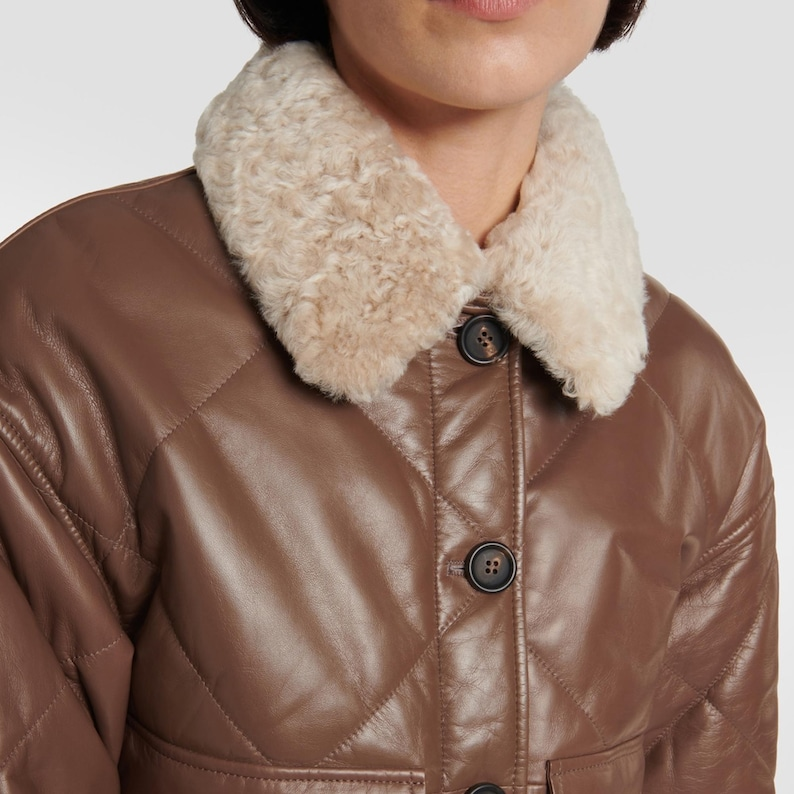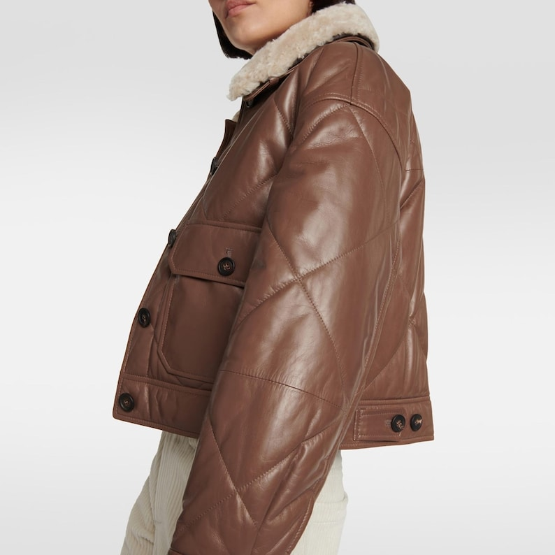 Brown Leather Jacket with Shearling Collar & Button Closure
