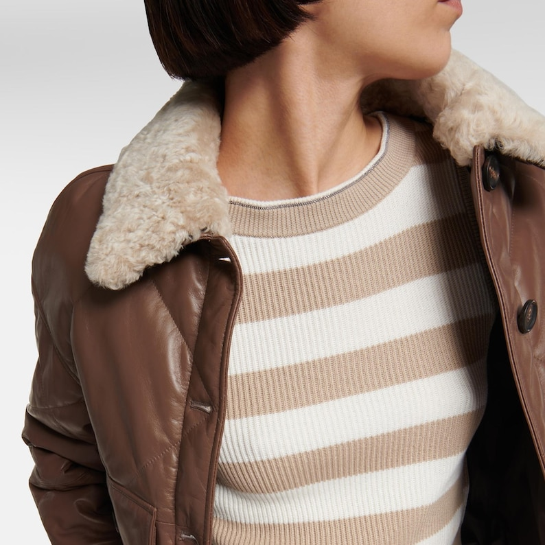 Vintage Quilted Leather Jacket with Brown Shearling Collar:
