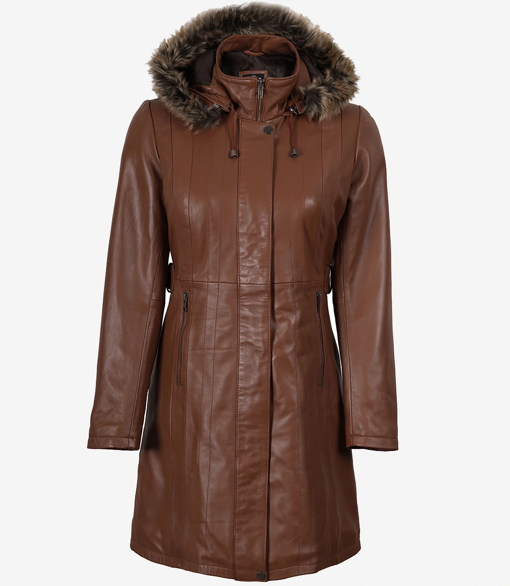 Women’s Brown Leather Long Coat Faux Fur Hood