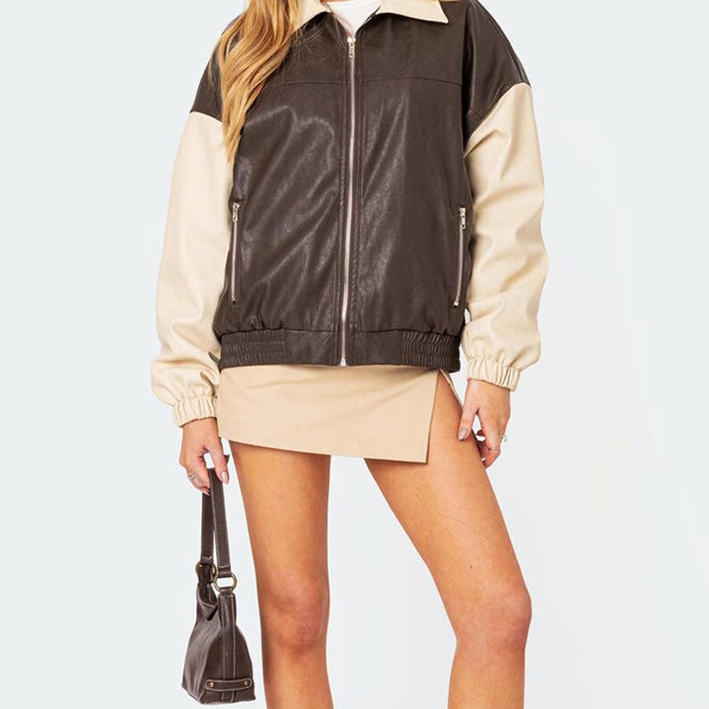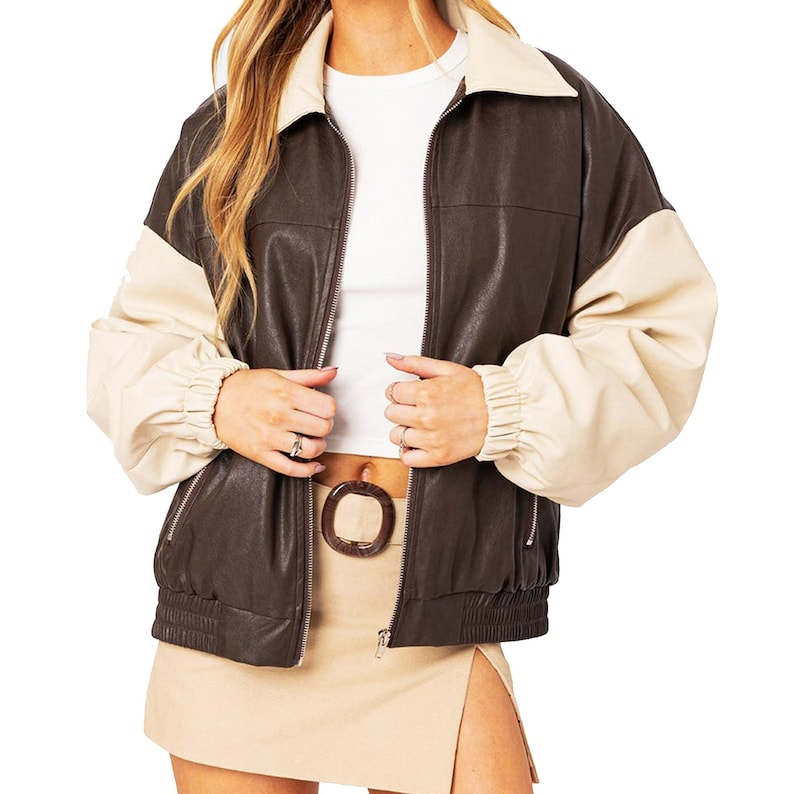 Women’s Two-Tone Lambskin Leather Bomber Jacket – 90s Vintage Style